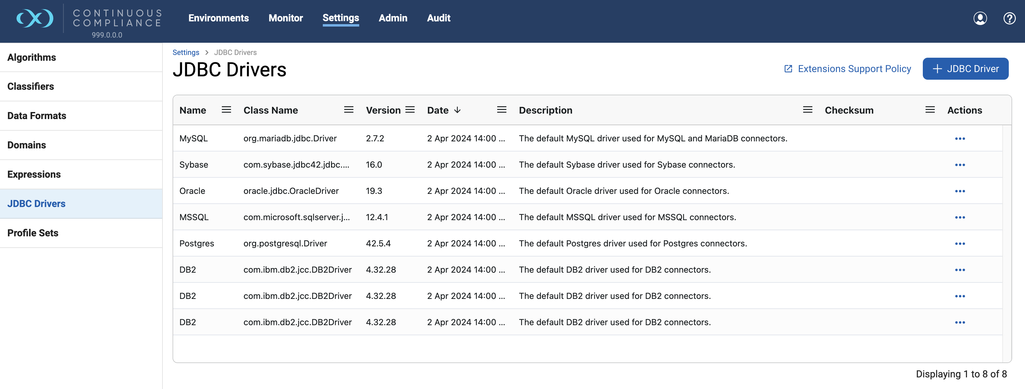 Extended Connectors allow you to upload additional JDBC Drivers to the Continuous Compliance Engine to enable masking of data sources not natively supported by Continuous Compliance.