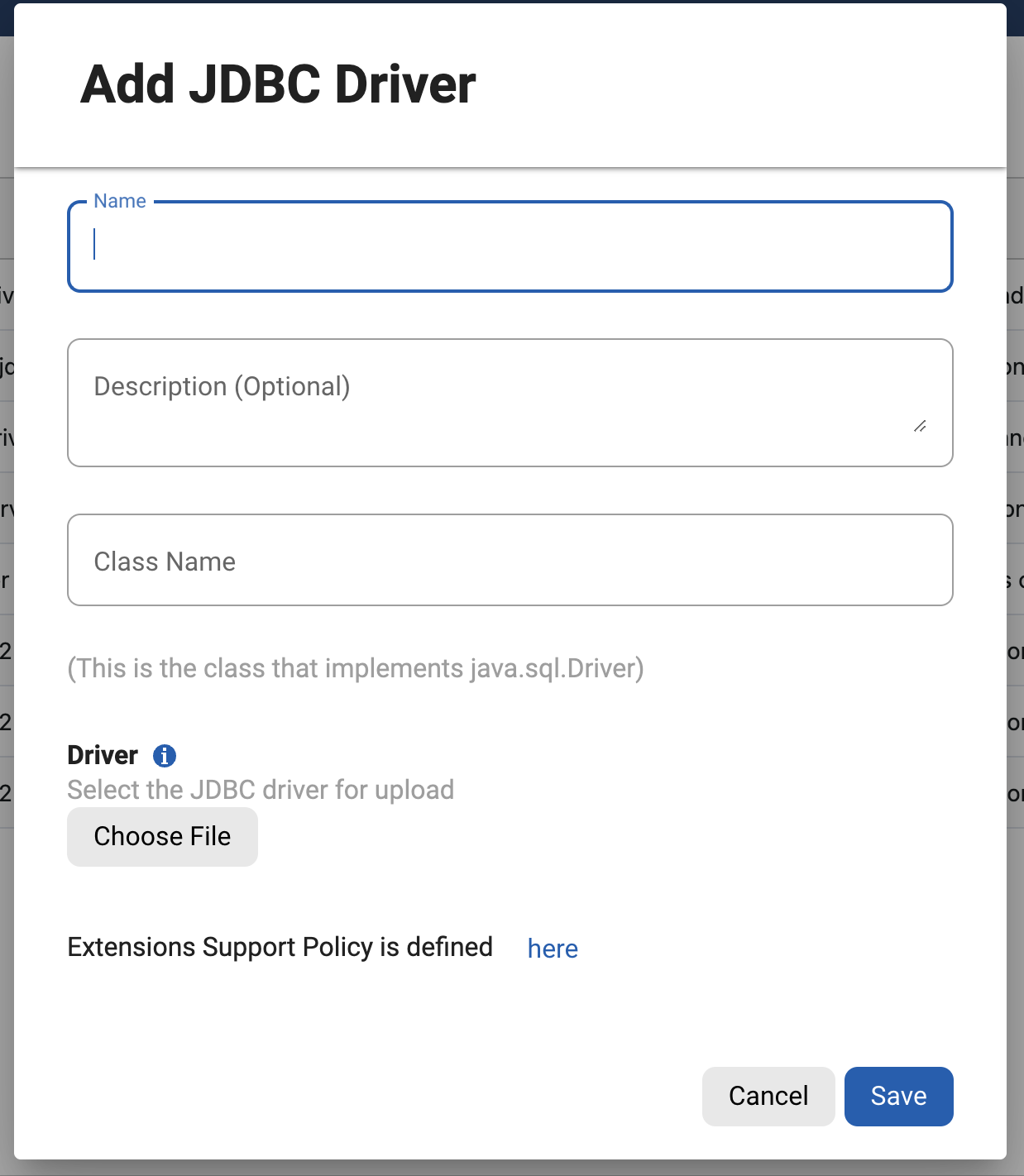 Clicking on the + JDBC Driver button will bring up a dialog box to upload the driver zip file and enter the driver's configuration details.