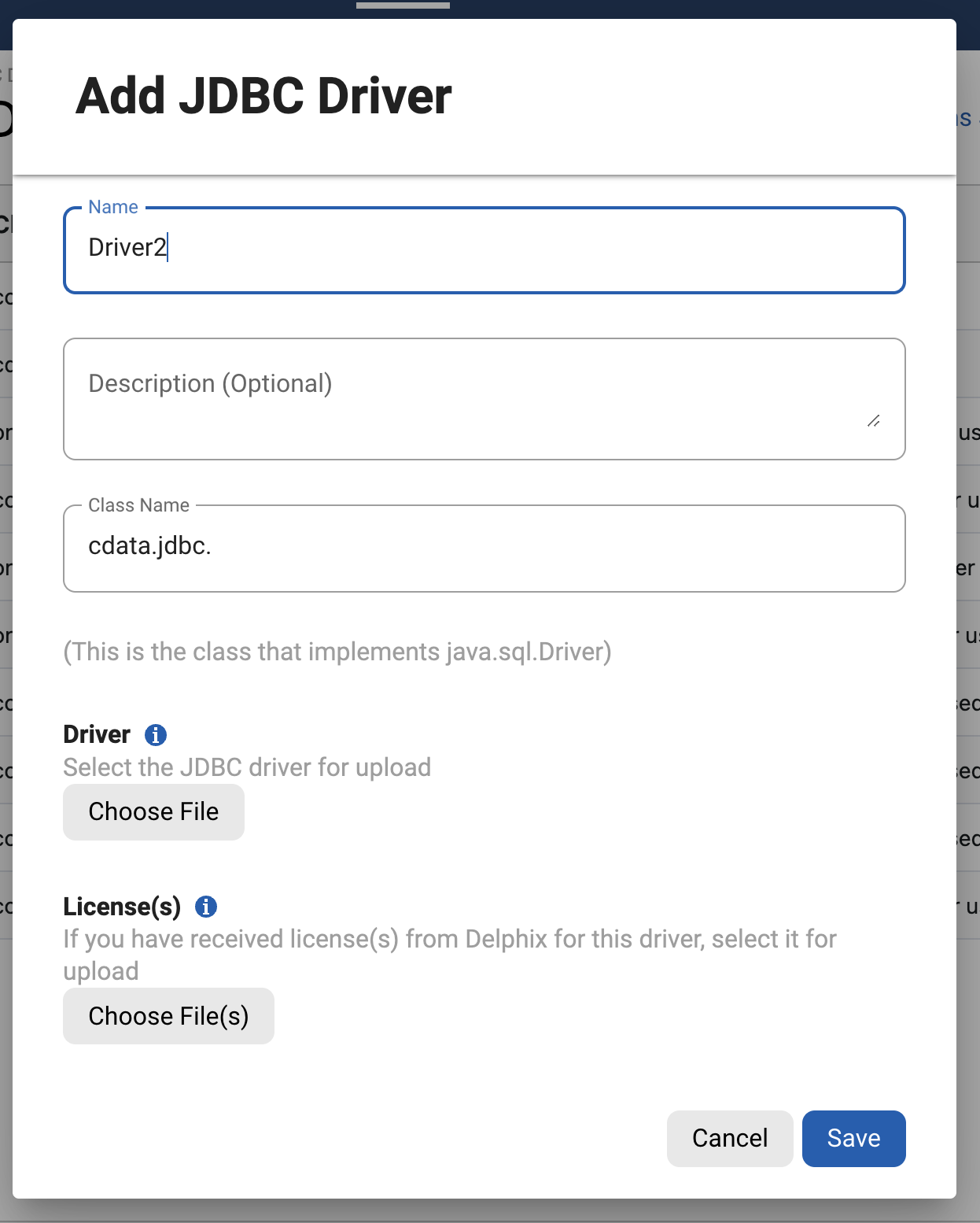 POST /licenseAPI endpoint orthe UI using the License file upload button in the Add or Edit JDBC Driver dialogue box. The License button appears on entering a valid CData JDBC driver class name as shown in this screenshot:
