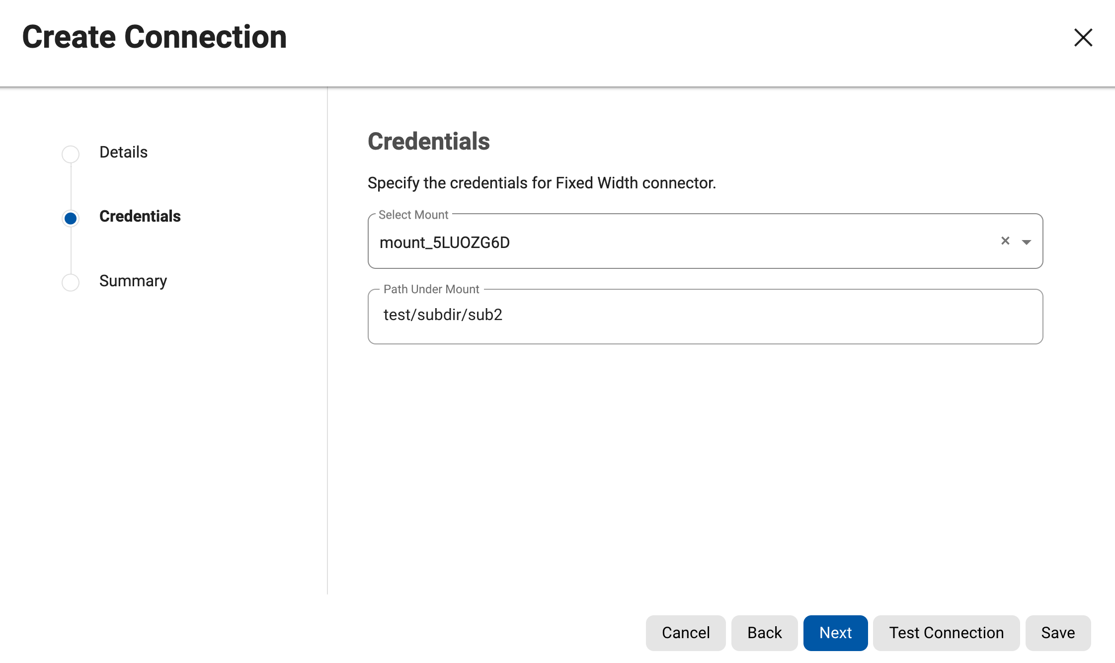 Credentials: On selecting the Filesystem Mount Point option, the mount name and a path inside the mount need to be specified in the Credentials step.