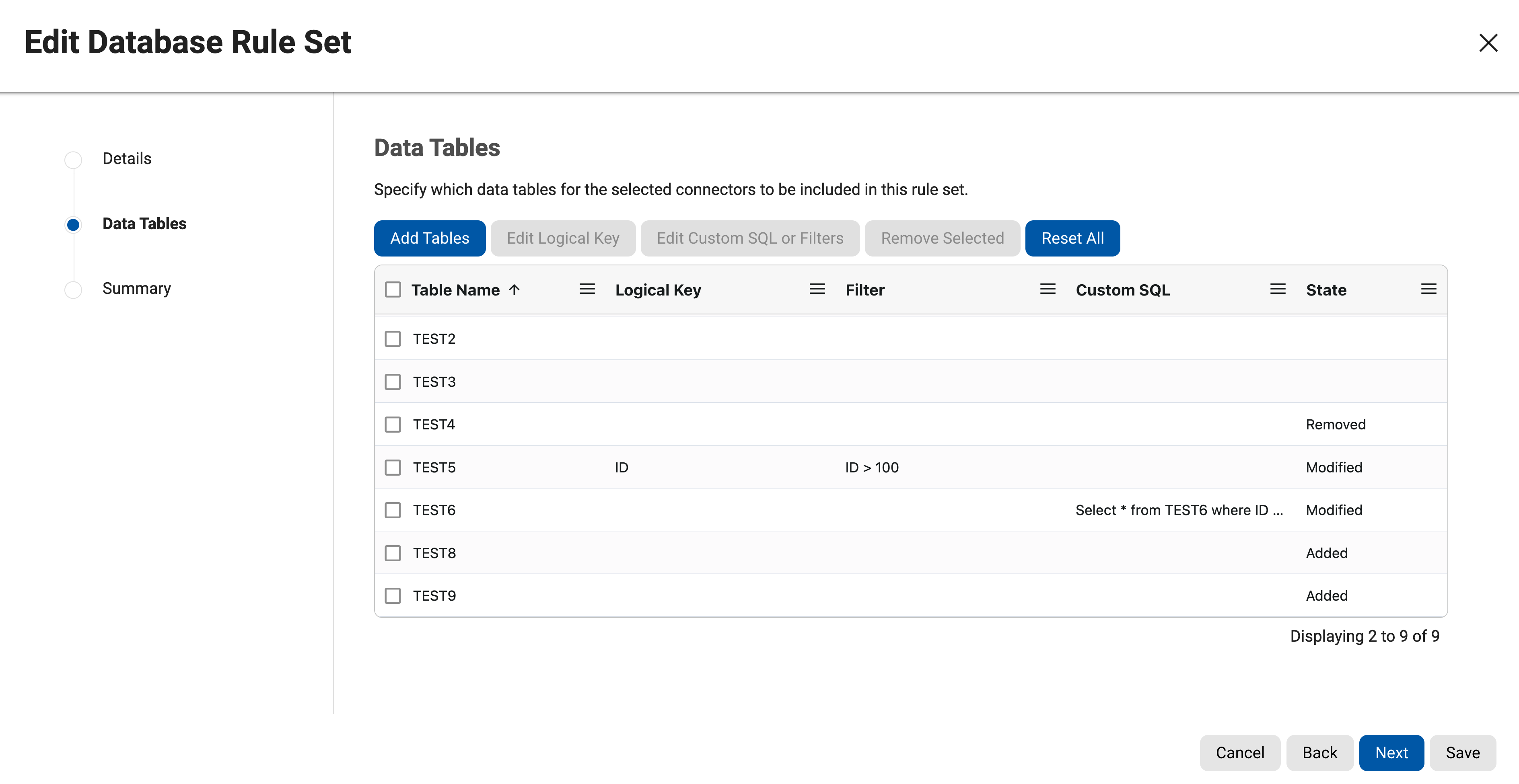 Once you've completed adding, modifying or removing files/tables from the ruleset, click on "Next" to continue.