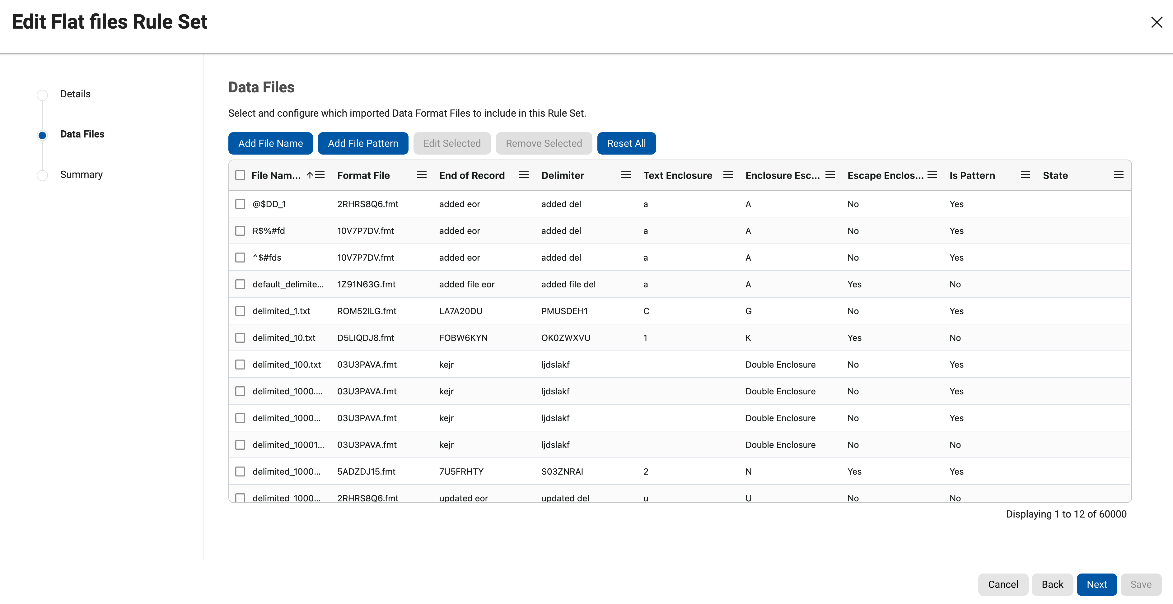 Click on the Save button to add all the files names or file patterns selected above to the Data Files grid.