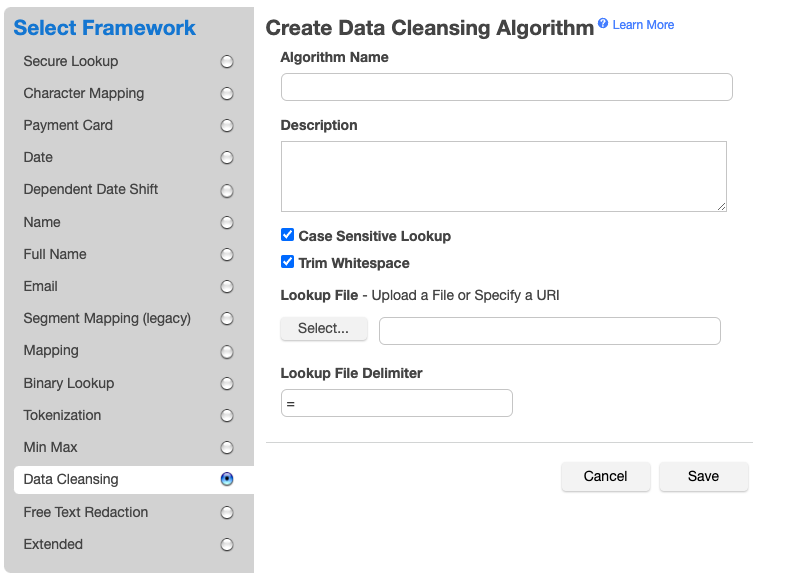 A data cleansing algorithm is used to standardize varied spellings, misspellings, and abbreviations for the same name. For example, “Ariz,” “Az,” and “Arizona” can all be cleansed to “AZ.” Use this algorithm if the target data needs to be in a standard format prior to masking.