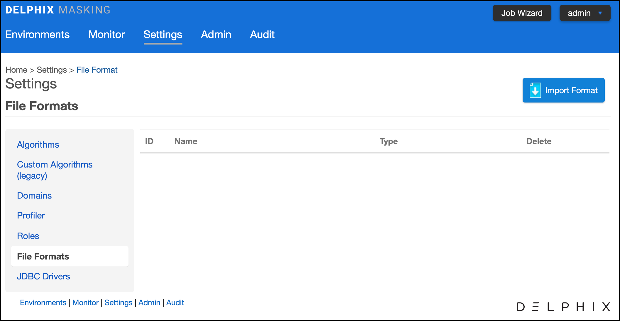 Unlike database files for the most part do not have built-in metadata to describe the format of the fields in the file. You must provide this to Delphix so it can update the file appropriately. This is done through the settings tab where you will see a menu item on the left for File Format. Select File Format and you will see an option to import a file format. This will depend on the type of file and how you want to let Delphix know the format of the file.