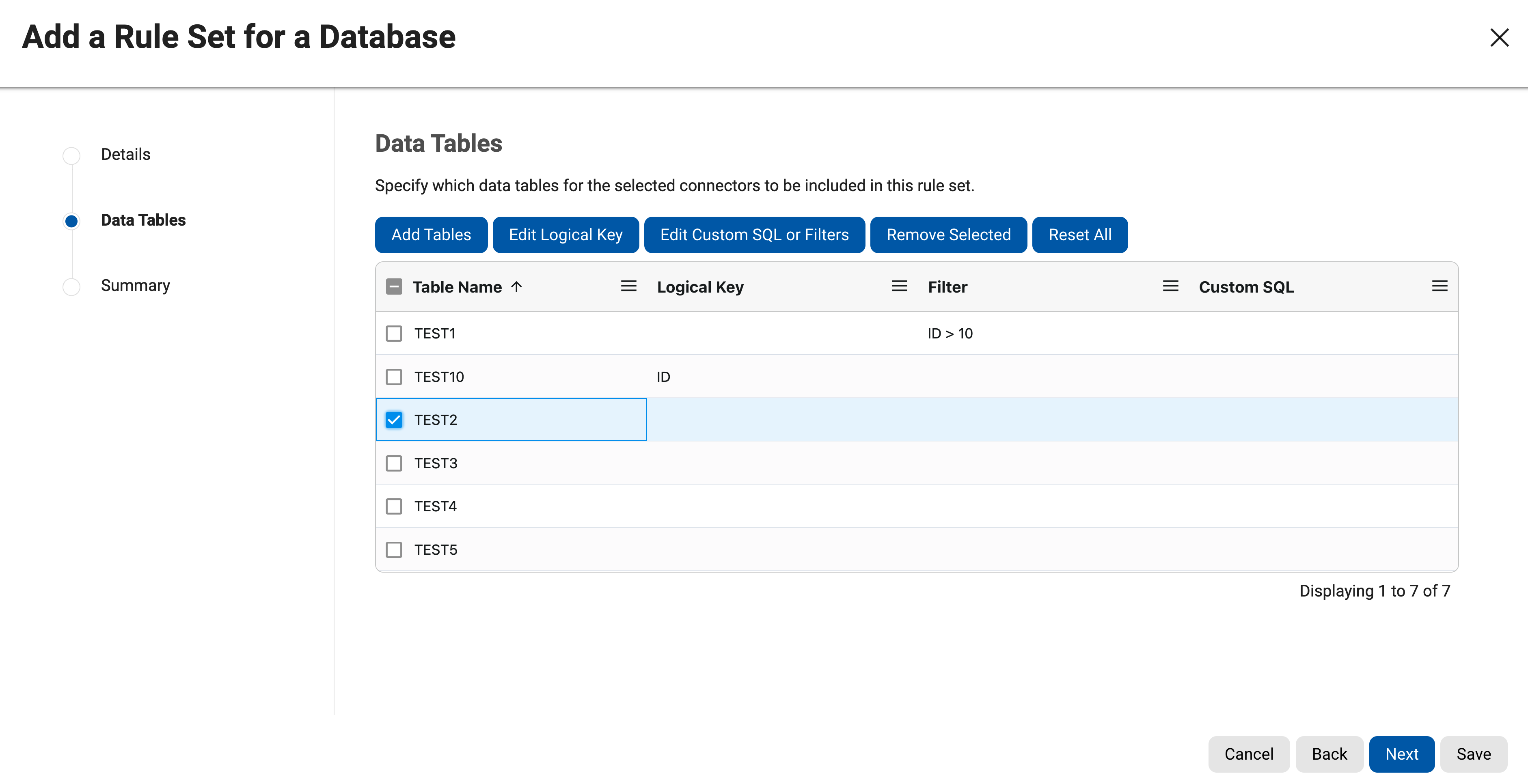 In the rule set wizard's second step (either "Data Tables" or “Data Files”), you can select one or more tables or files either by clicking on the checkboxes or by clicking anywhere on the rows.
