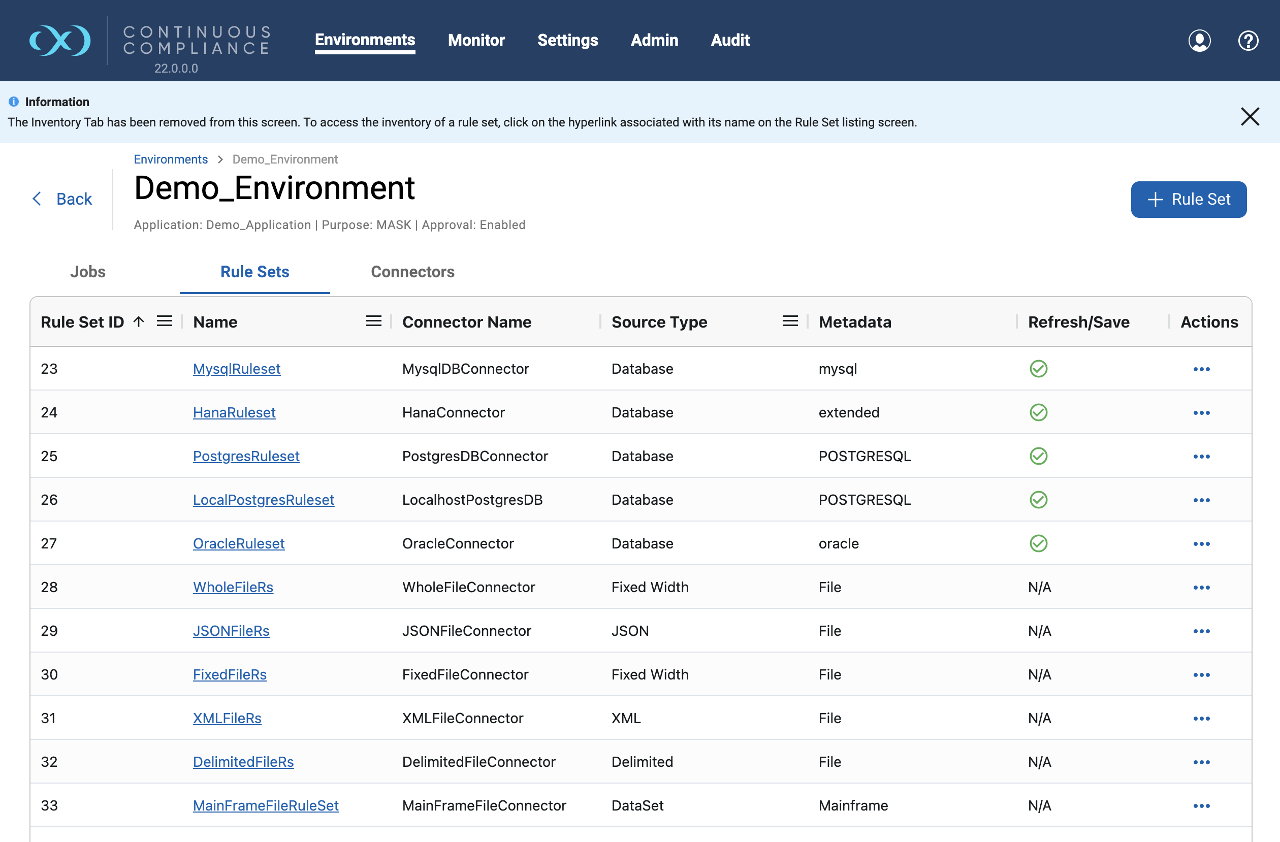 Refreshing a rule set will result in the columns in the tables in the rule set being rescanned. As a result, the inventory associated with the rule set will also be refreshed, but any pre-existing algorithm assignments will be retained.