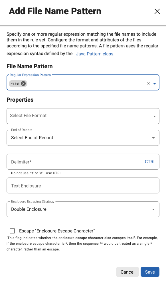 Delimited: File Name or Pattern, Format File, End of Record, Delimiter, Text Enclosure, Enclosure Escape Strategy, Escape Enclosure Escape Character, Is Pattern.