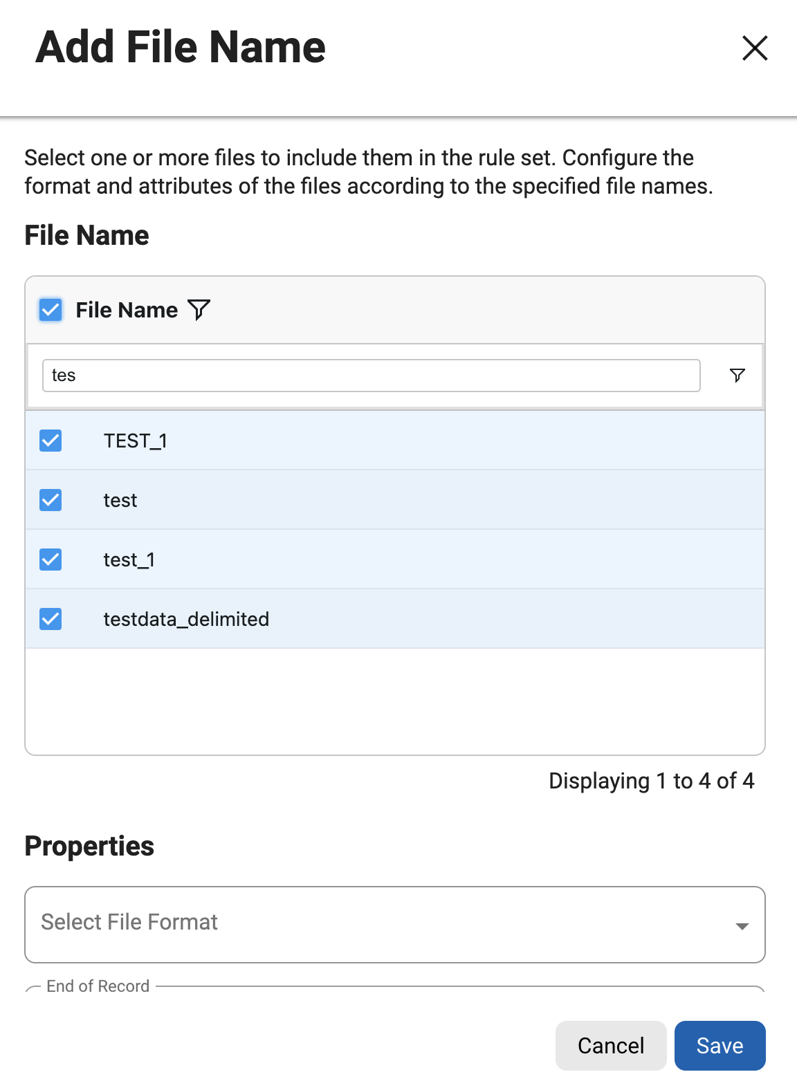 A dialog box titled "Add File Name” will appear, the “File Name” table lists all the files accessible by the selected connector. You can choose multiple files to include in the rule set. File names can be filtered by using a substring condition. For more details on grid filtering and sorting, refer to the information here.
