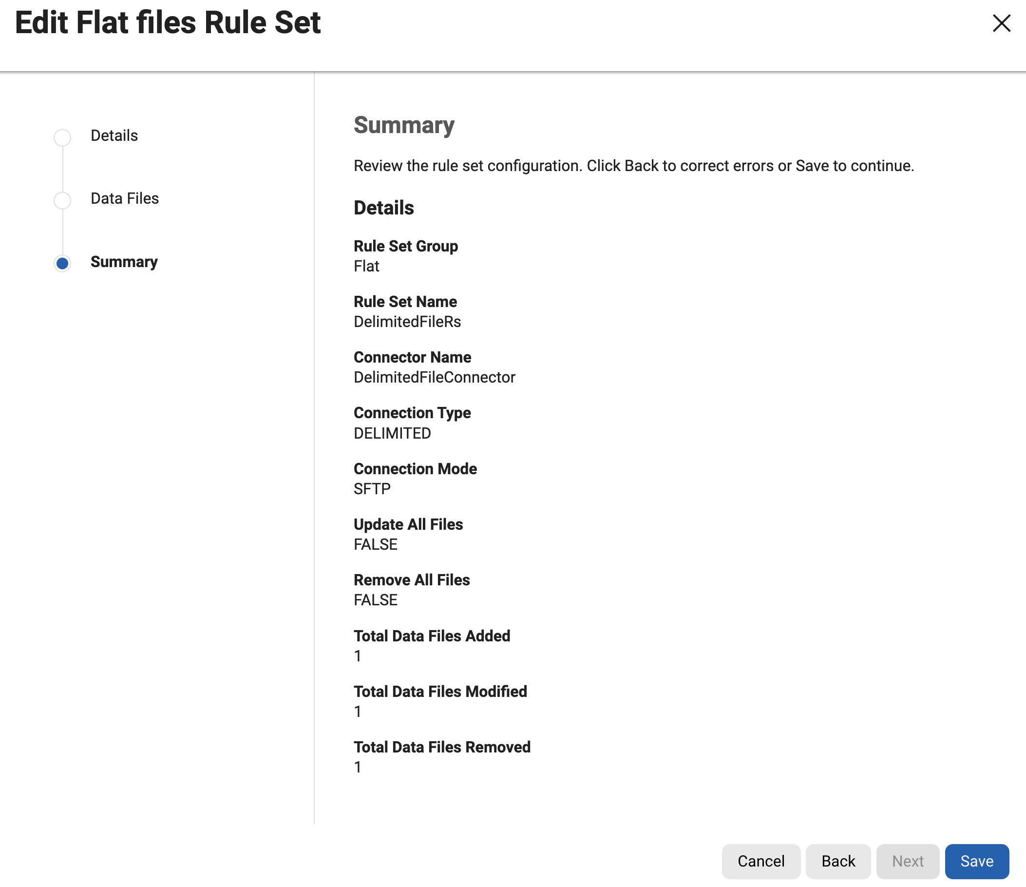 Review the rule set configuration. Click Back to correct errors or Save to continue.