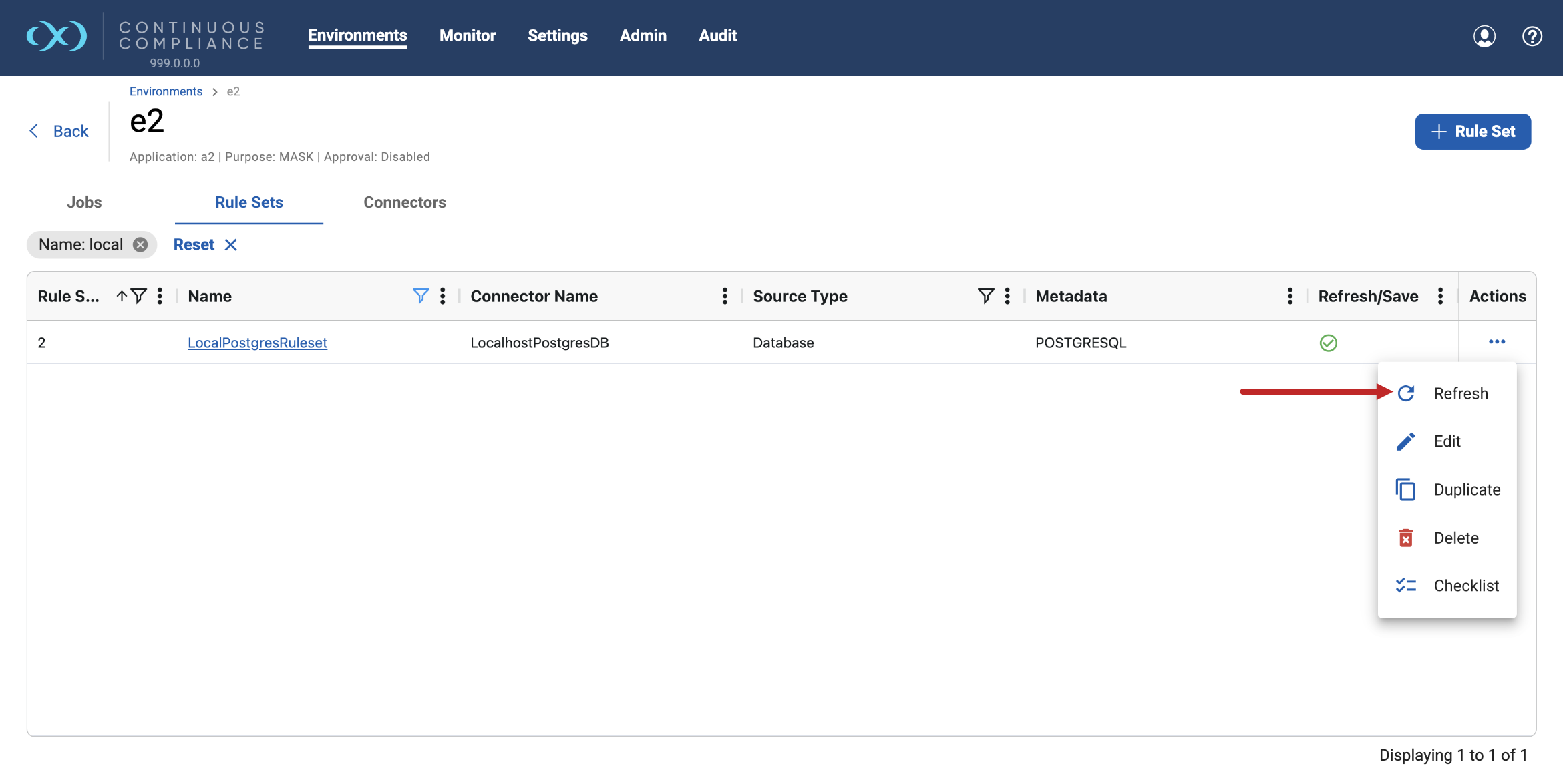 Click the Actions (…) drop-down to the right of a rule set on the rule set screen, and then select the Refresh option.